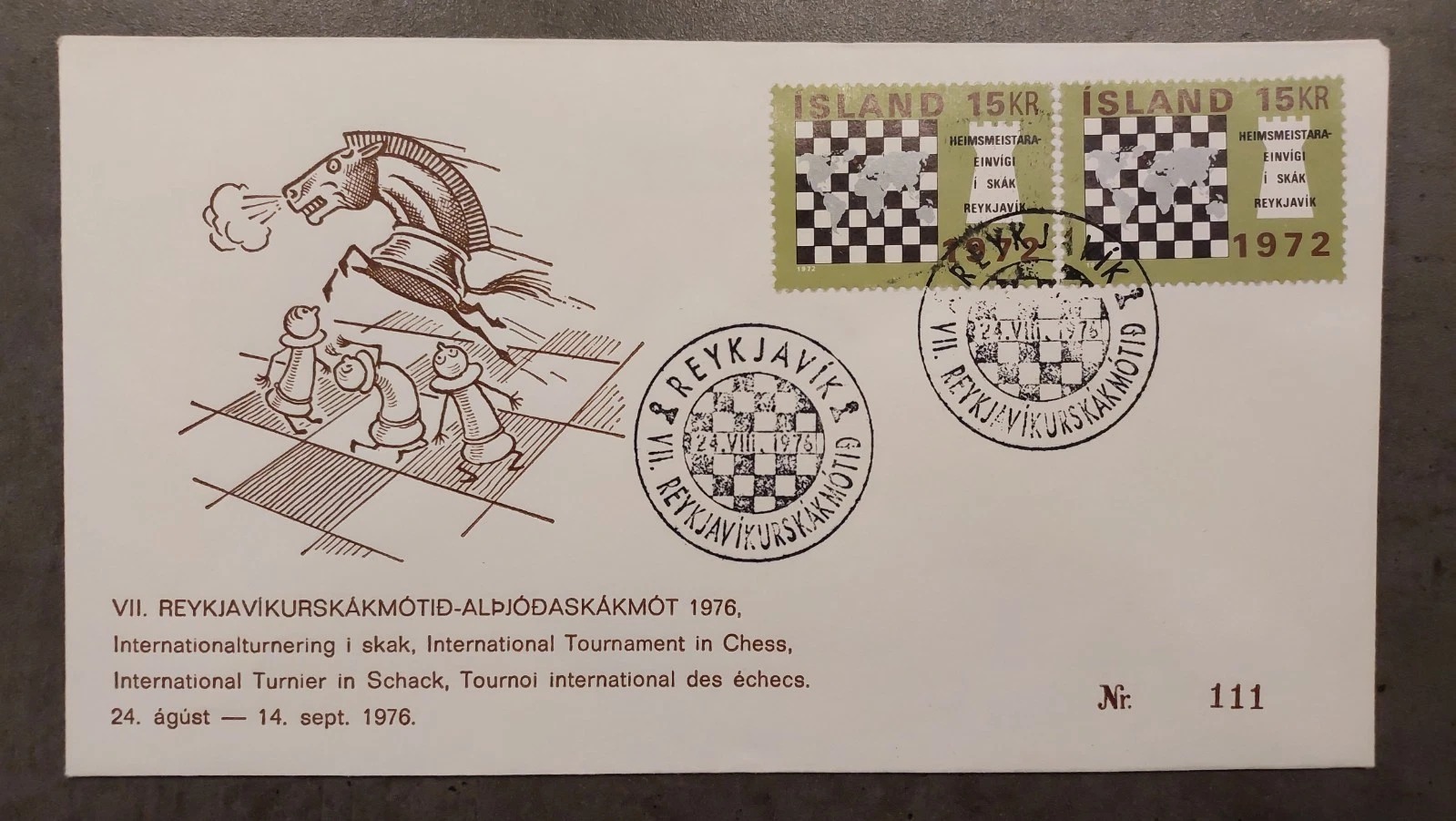 Iceland 1972 Fischer-Spassky World Chess Championship Postcard – Icelandic Chess Federation Board Caricatures