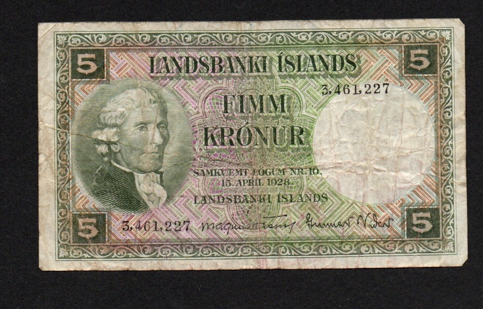 1928 ICELAND 5 KRONUR NOTE
