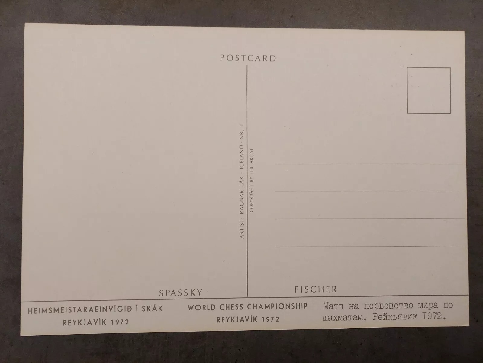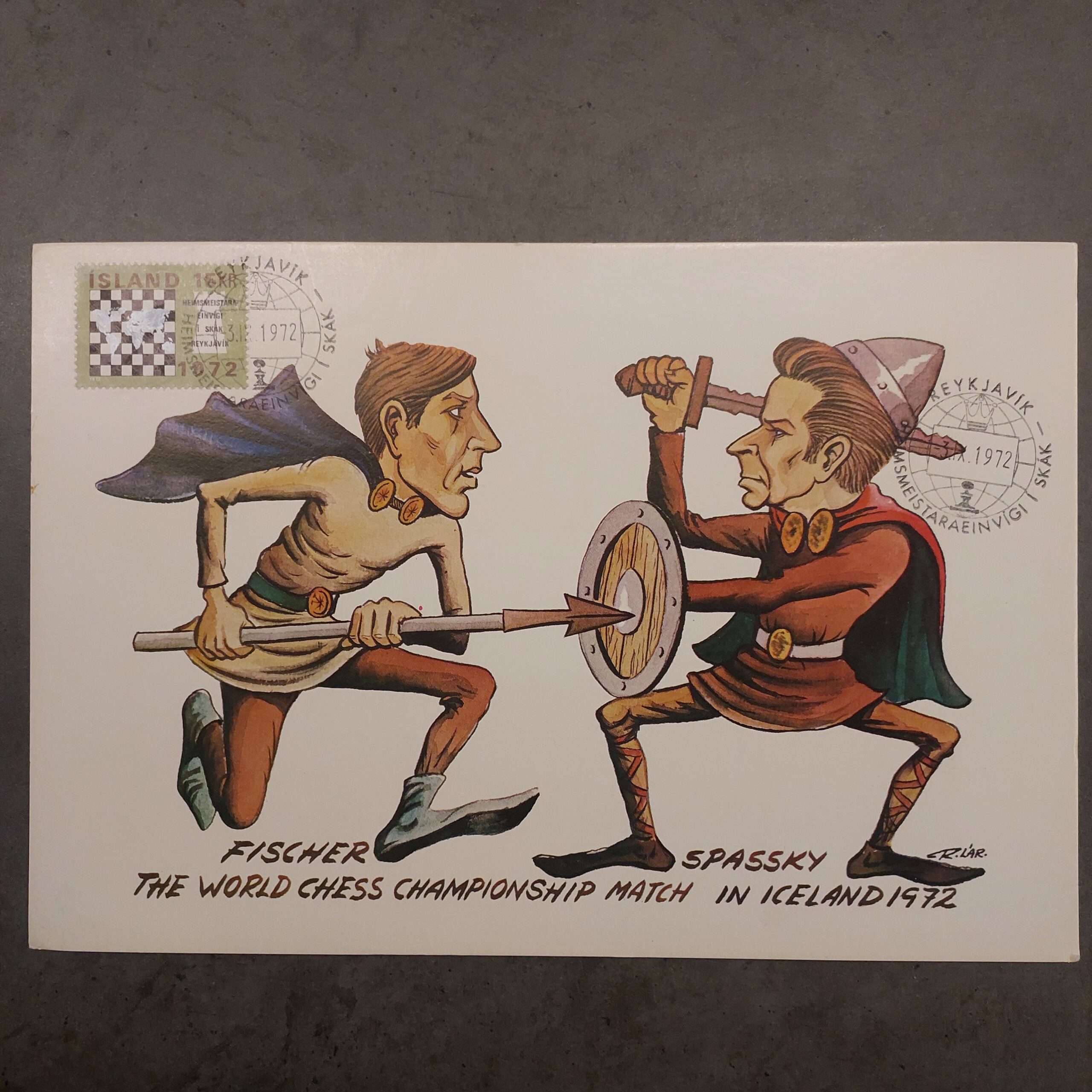 In the summer of 1972, Reykjavík turned into the chess capital of the world as Fischer and Spassky faced off in the most famous match ever played. This postcard from the Icelandic Chess Federation captures the drama perfectly – turning the two players into Viking warriors locked in battle, spear vs sword, all drawn by…