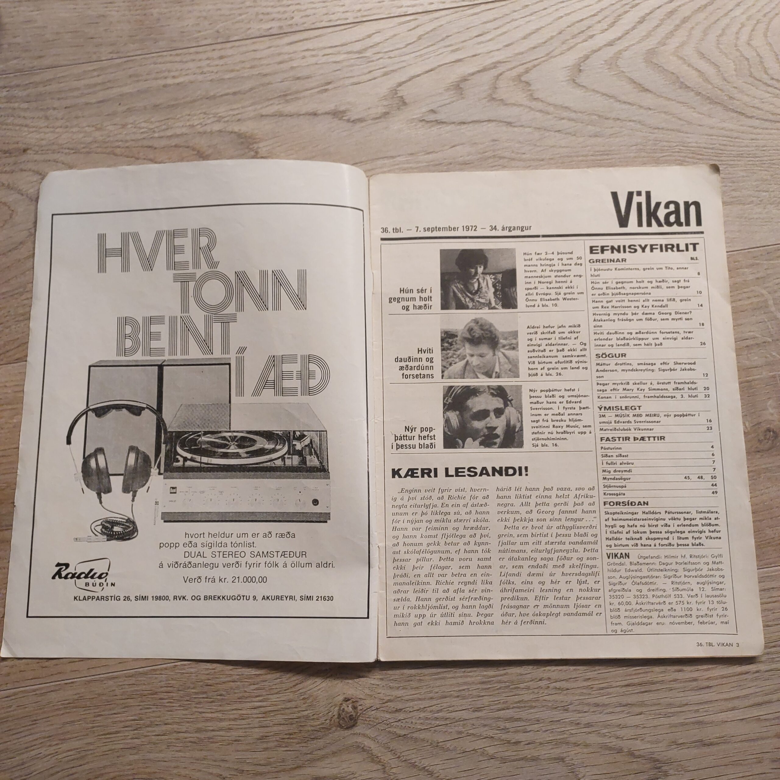 Complete issue of the Icelandic weekly magazine Vikan, volume 34, number 36, dated 7 September 1972. The front cover features a color caricature by artist H.B. showing Bobby Fischer as a red chess piece (with raised hands) facing Boris Spassky as a white chess piece on a chessboard. The magazine covers the ongoing World Chess Championship match held in Reykjavík, Iceland.