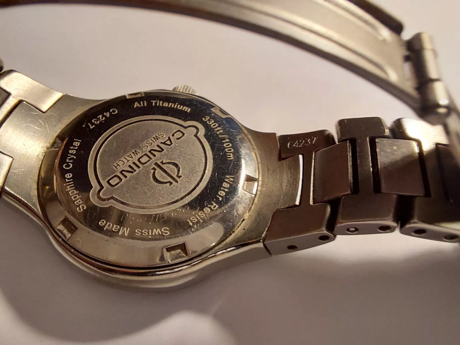 This is a ladies wristwatch by Candino (Swiss brand). The case and bracelet are made of titanium (marked “All Titanium” on the case back), giving it a lightweight yet durable construction. The round case features a white dial with black baton markers, luminous hands, date window at 3 o’clock, and red “TITANIUM” text at 6 o’clock. The bezel is stainless steel with engraved numerals (10–60) and a coin-edge texture. The case back is engraved “CANDINO”, “Sapphire Crystal”, “Water Resist 100m/330ft”, “Swiss Made”, with reference numbers including “C4237”. The crown is signed and knurled. The watch has a stainless steel link bracelet with fold-over clasp. Movement is Swiss quartz. Water resistance is 100m/330ft.