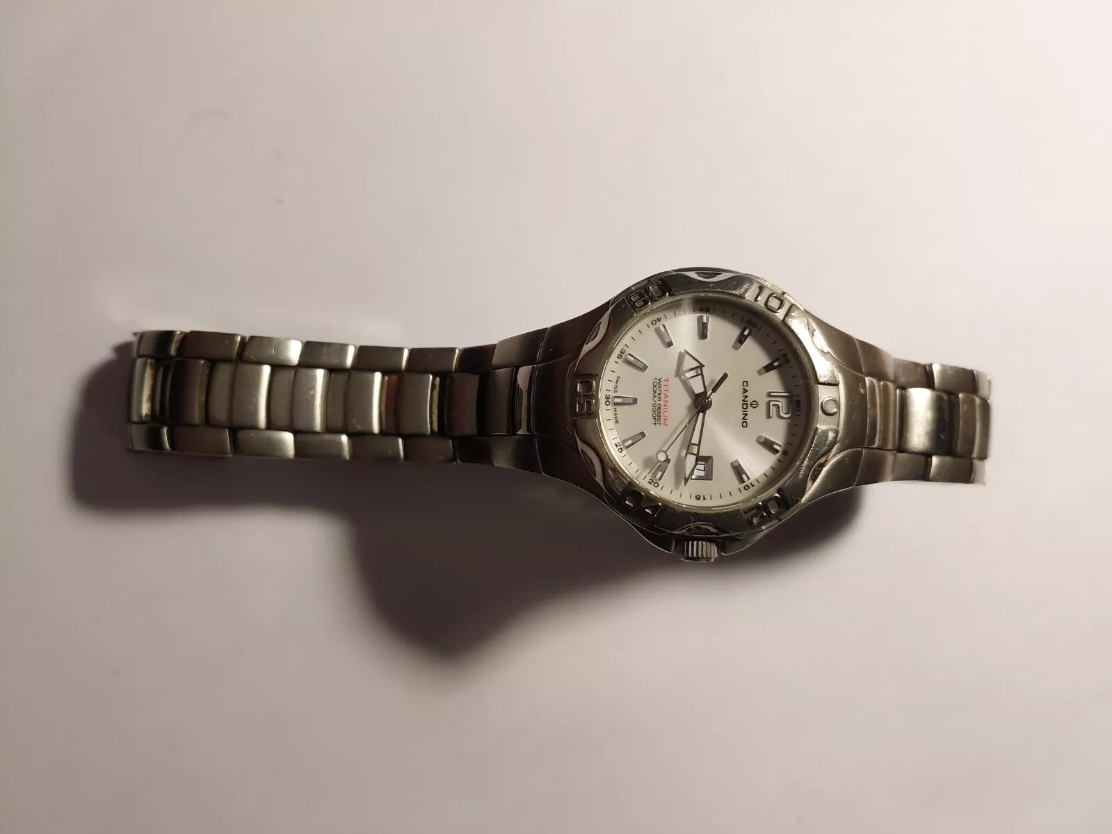 This sleek Swiss-made Candino from the titanium era is a hidden gem—ultra-lightweight full-titanium case and bracelet, crisp white dial with date, sapphire crystal, and legit 100m water resistance. The red “TITANIUM” stamp at 6 o’clock and that bold numbered bezel give it real 90s/2000s sport-luxe attitude. Perfect for everyday wear without feeling heavy.