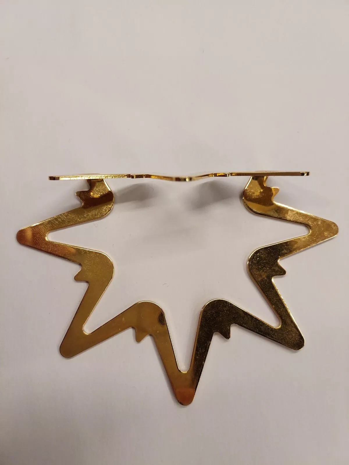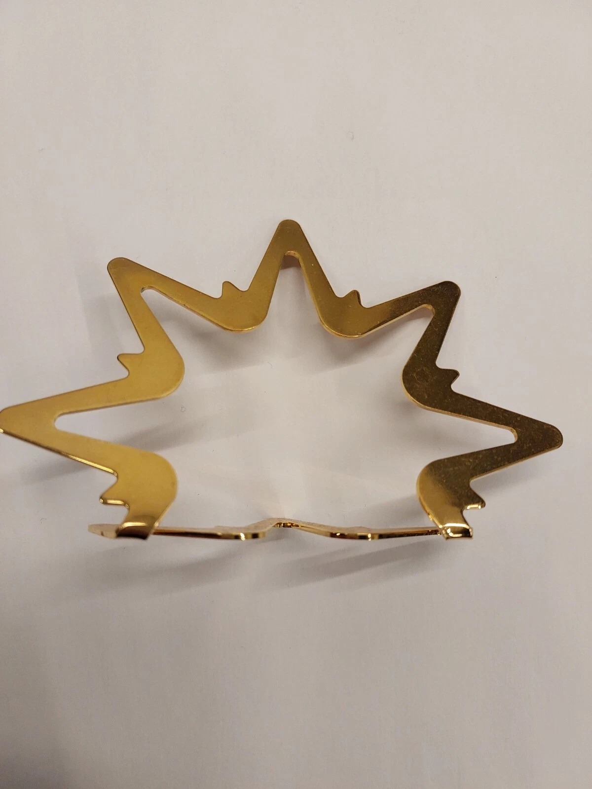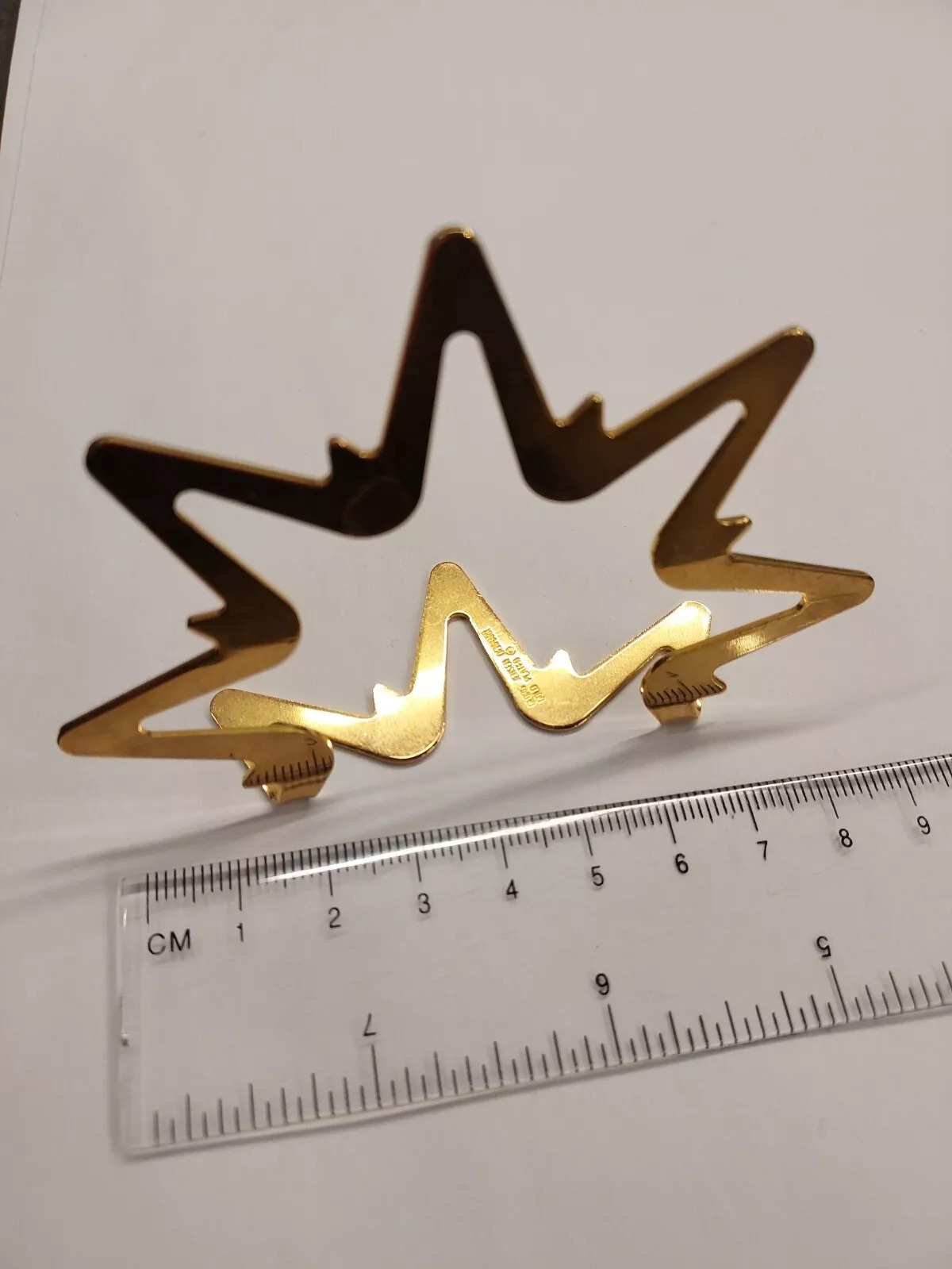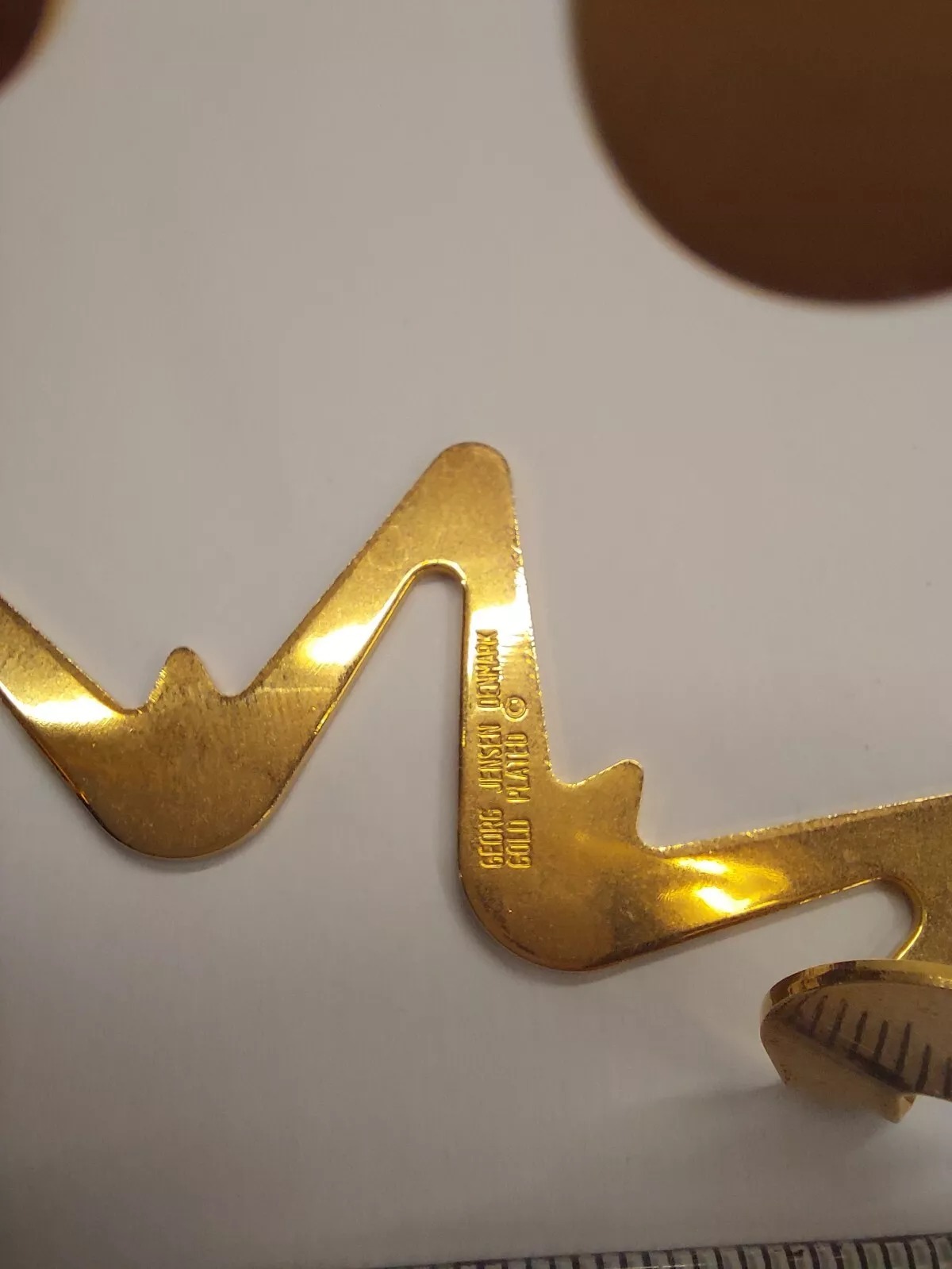 This elegant vintage display stand from Georg Jensen, Denmark, is crafted in gold-plated metal and designed to hold and showcase Georg Jensen’s iconic Christmas star ornaments or similar decorative pieces. The abstract, flowing wave/zigzag form with cutouts creates a dynamic, sculptural silhouette—modernist and artistic, allowing the ornament to “float” dramatically while the stand remains stable.