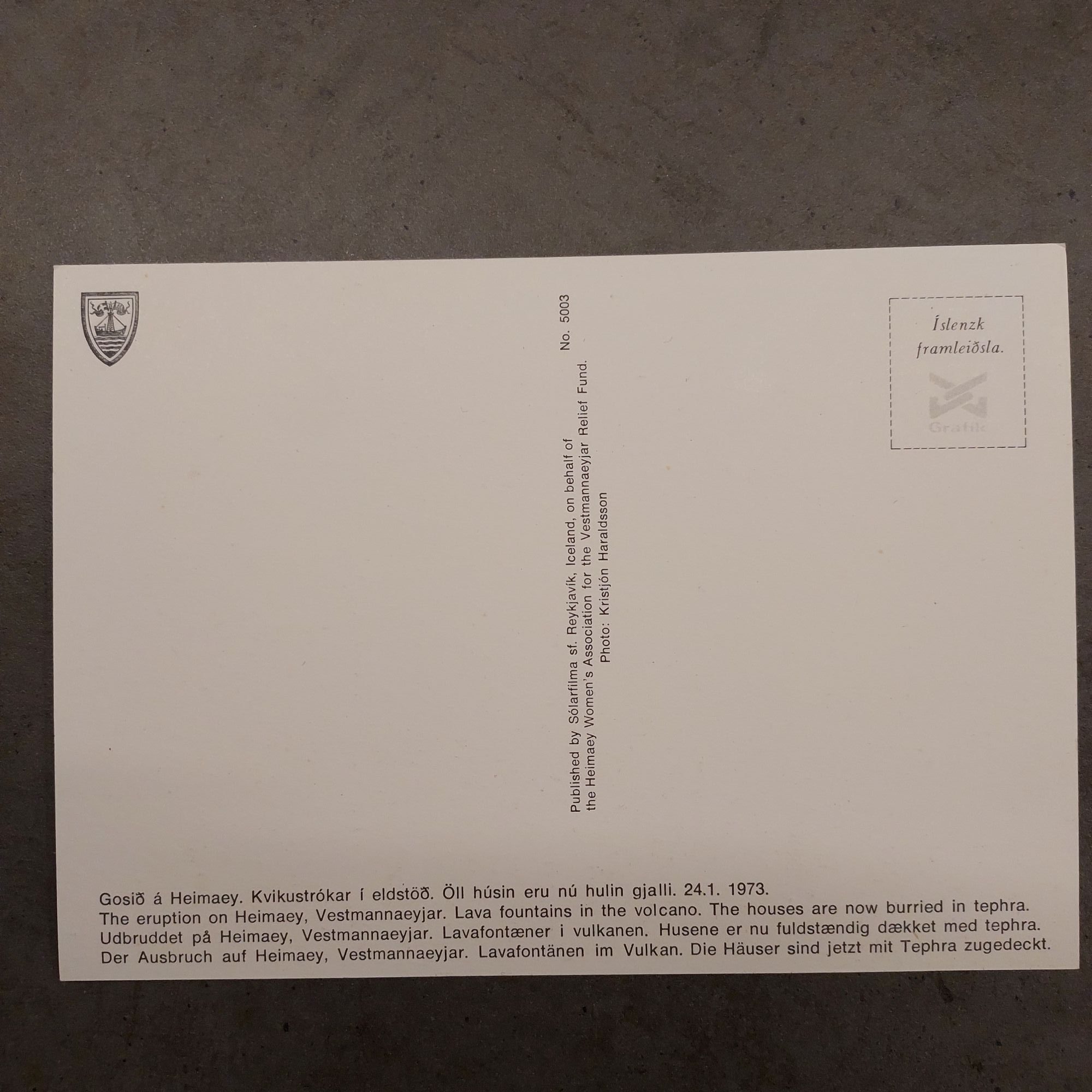 The back is multilingual (Icelandic, English, German) with the caption: “Gosið á Heimaey. Kvikustrókar í eldstöð. Öll húsin eru nú hulin gjalli. 24.1.1973.” (The eruption on Heimaey. Lava fountains in the volcano. The houses are now buried in tephra. January 24, 1973.) It notes publication by Sólarfilma sf. Reykjavík on behalf of the Heimaey Women’s Association Relief Fund, with photo credit to Kristján Haraldsson. Produced by Íslenzk framleiðsla / Grafík, numbered No. 5003.