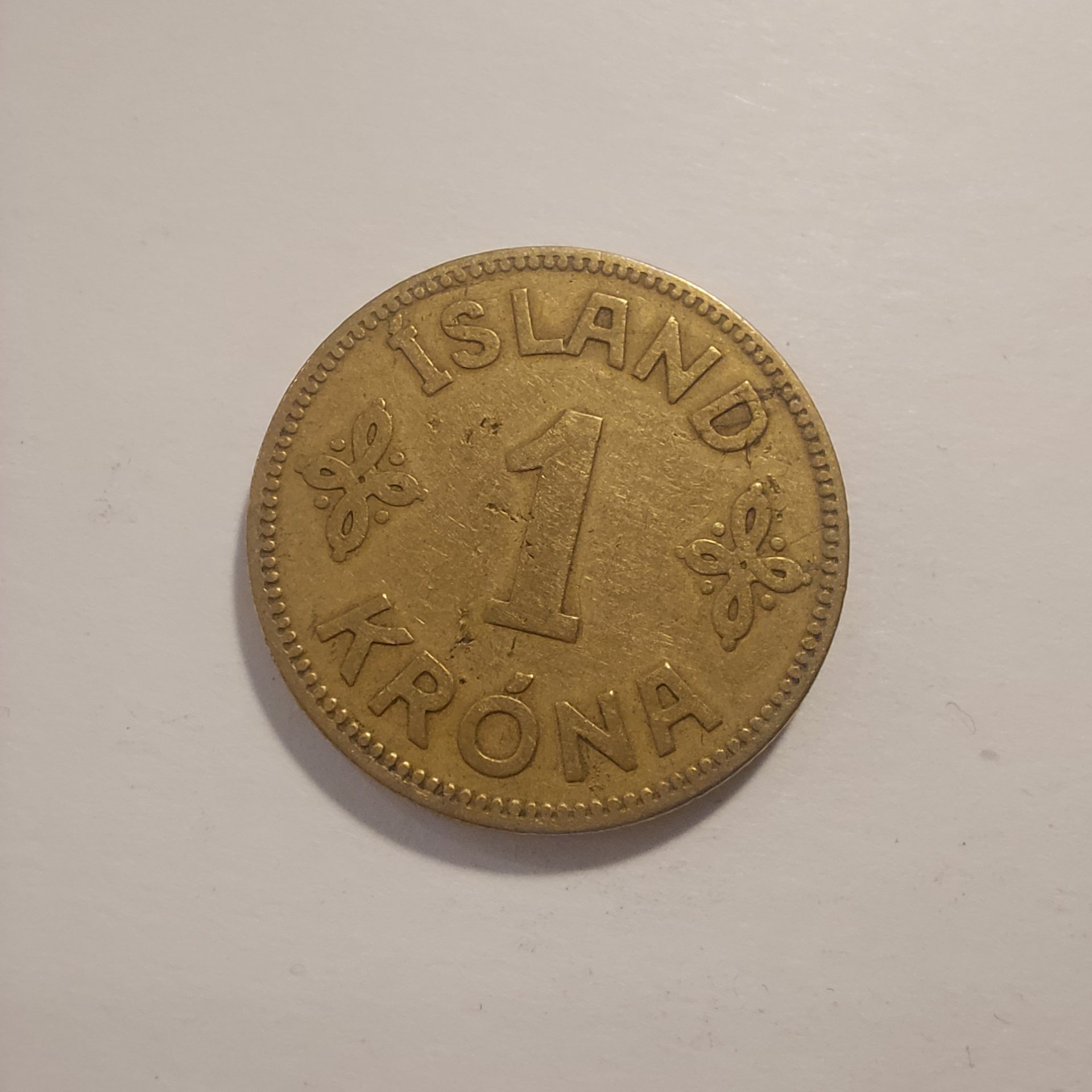 - Reverse: Large denomination “1” in the center flanked by floral ornaments, with “KRÓNAN” above and “ÍSLAND” below.