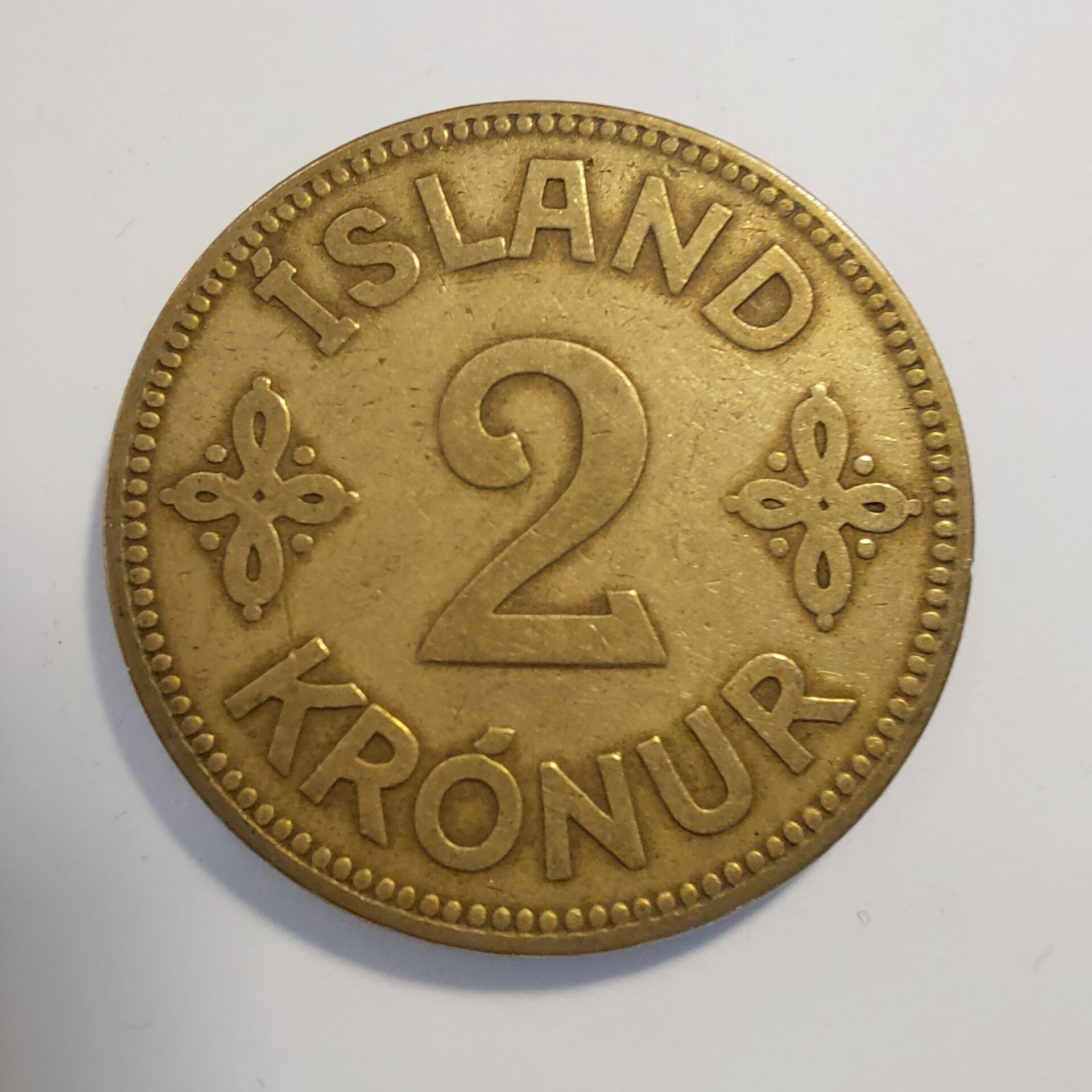 Aluminium-bronze coin issued in 1929 for circulation in Iceland. Obverse features the crowned coat of arms of Iceland with the royal monogram C X R of King Christian X. Reverse displays the denomination “2 KRÓNUR” with “ÍSLAND” above and the year “1929” below, flanked by ornamental designs. Minted at the Copenhagen Mint with mint marks N-GJ. KM#4.1. Weight 9.5 g. Diameter 28 mm. Mintage 77,087.