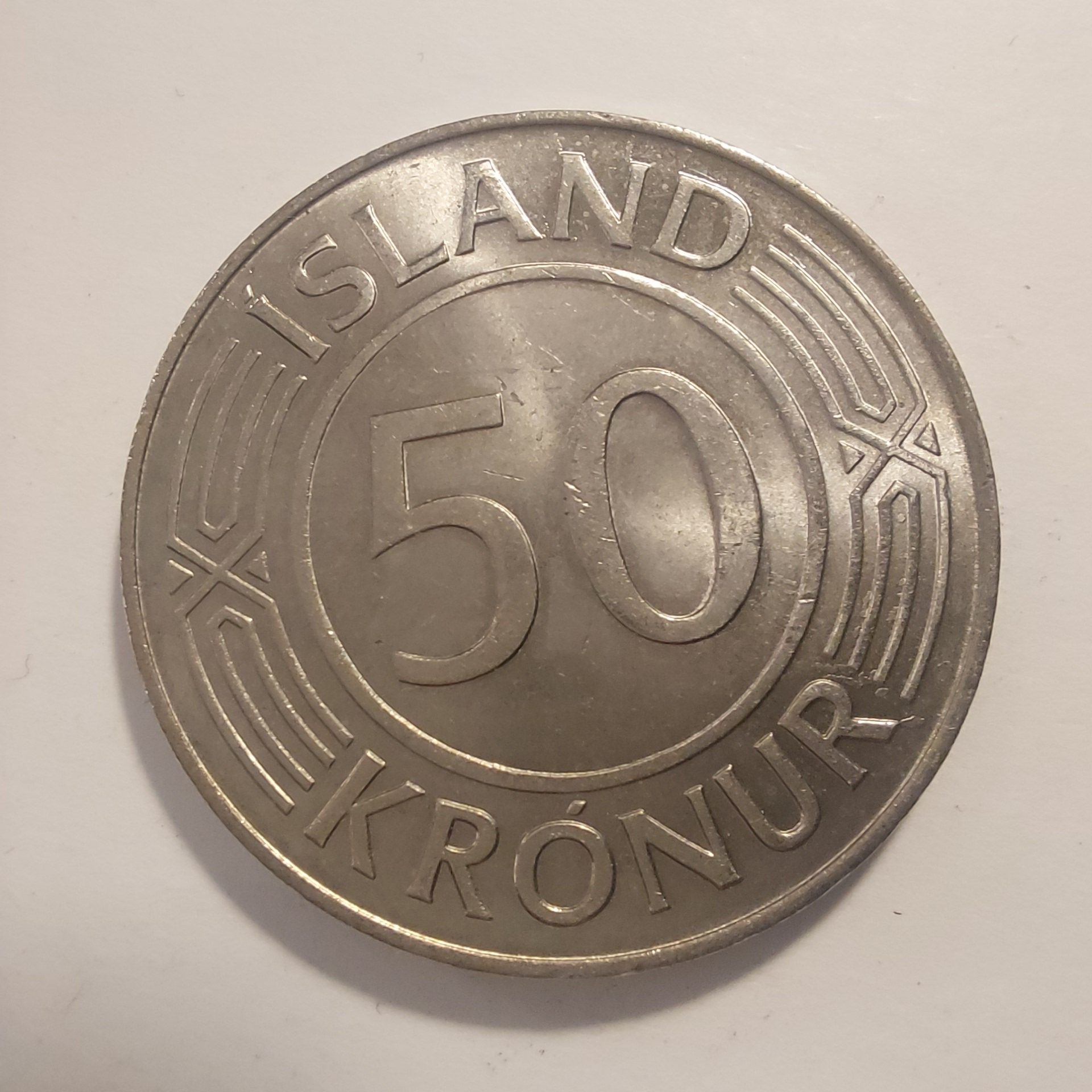• Reverse: Denomination “50” in the center, surrounded by “ÍSLAND” above and “KRÓNUR” below, with decorative wave-like patterns radiating outward.