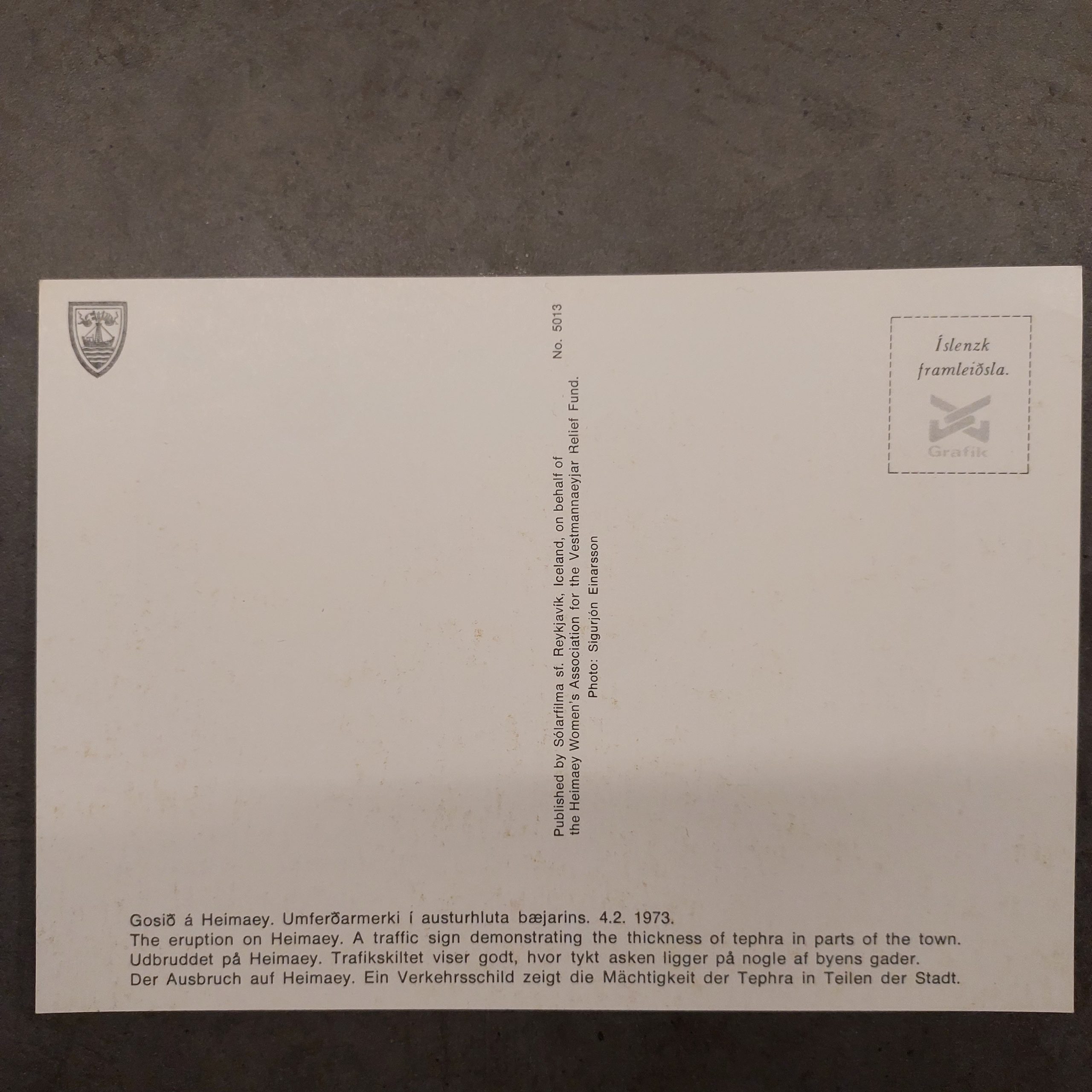 The back is multilingual (Icelandic, English, German) with the caption: “Gosið á Heimaey. Umferðarmarki í austurhluta bæjarins. 4.2.1973.” (The eruption on Heimaey. A traffic sign in the eastern part of the town. 4.2.1973.) It notes the photo by Sigurjón Einarsson, published by Sólarfilma sf. Reykjavík on behalf of the Heimaey Women’s Association for the Vestmannaeyjar Relief Fund (Heimaey Women’s Association Relief Fund), with production by Íslenzk framleiðsla / Grafík. Numbered No. 5013, it served as a fundraising item to support the relief efforts after the eruption forced evacuation of nearly the entire population and buried much of the town.